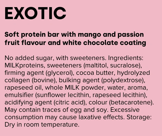 Tropikai kišenėje. Mango + passion + baltas šokolado sluoksnis — skonis kaip „poilsis“, bet pateikiamas kaip minkštas baltymų batonėlis. Kai šokoladas kartais būna per „rimtas“, Exotic yra tas linksmas variantas, kuris iškart palengvina dieną.